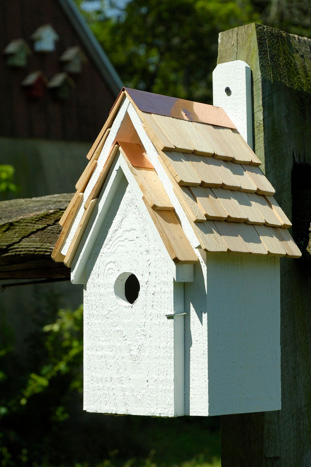 Thoughtful amenities — cleanout access through a hinged front door, excellent floor drainage, roof ventilation, and a rear mounting paddle for easy hanging — ensure a comfortable, well-kept environment for its distinguished feathered guests. The 1½" entry hole provides the ideal balance of privacy and prestige. Sophisticated, serene, and beautifully made — the perfect statement piece for a garden that values both beauty and craftsmanship.