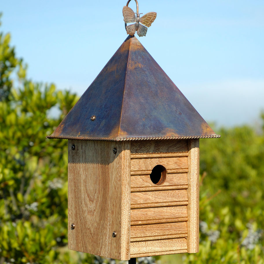 Crafted from rich, durable mahogany, this classic design offers a sense of familiarity and enduring beauty, crowned with a beautifully finished copper roof that lends both strength and quiet elegance. Thoughtful details set this home apart, from the carefully assembled siding secured with bronze-plated screws to the graceful hanging loop above. A delicate copper butterfly rests upon the roof, a subtle flourish that echoes the gentle motion Welty so lovingly observed. A 1⅜" entry welcomes wrens, chickadees, nuthatches, and titmice, while expert handcraftsmanship ensures this piece will be enjoyed for years to come.